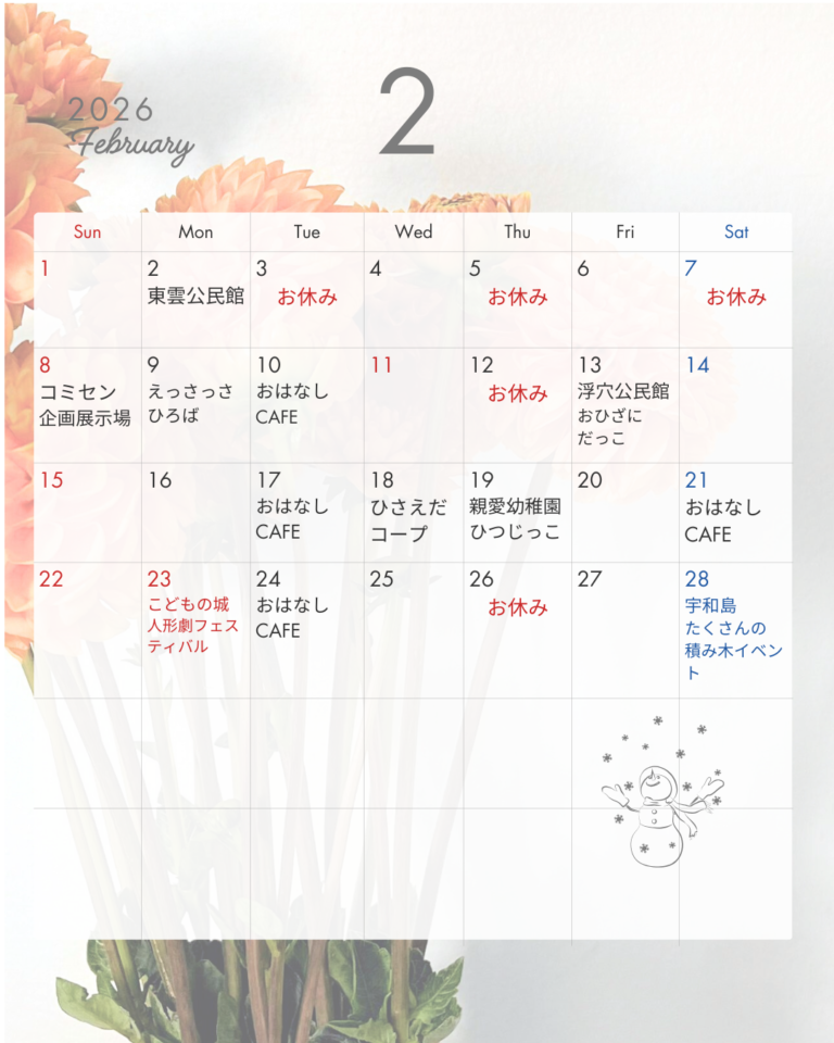 2月のイベント ★10時~15時 コミセン企画展示場2階に居ます。 ★11時~音楽おはなし会(コミセン企画展示場2階) 14時~音楽おはなし会(コミセン企画展示場1階)