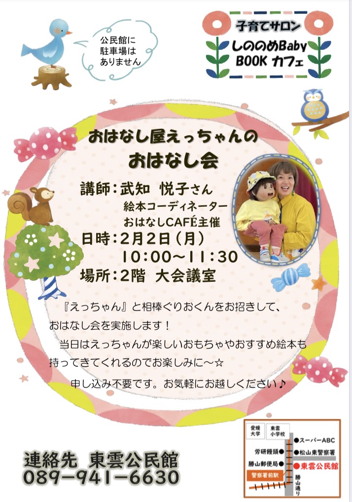 おはなしCAFE1月6日からです ★誰もが参加できるイベントも掲載しています。 ★おはなしCAFEってどんなところ?って思われた方は「Instagram:ohanashicafe」を ご覧ください。Instagramのストーリーに様子を投稿しています。また絵本の紹介&イベント情報なども Instagramが一番早いです。 ★新年早々の1月も土曜日のおはなしCAFEがお休みで申し訳ございません。